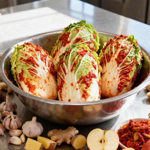 5.拌酱:将辣椒调味酱拌入到脱盐的白菜中,拌入辣椒调味酱时,从白菜内叶到外叶逐层均匀地涂抹。辣椒调味酱的加入量为白菜重量的2.5%至3.5%。
